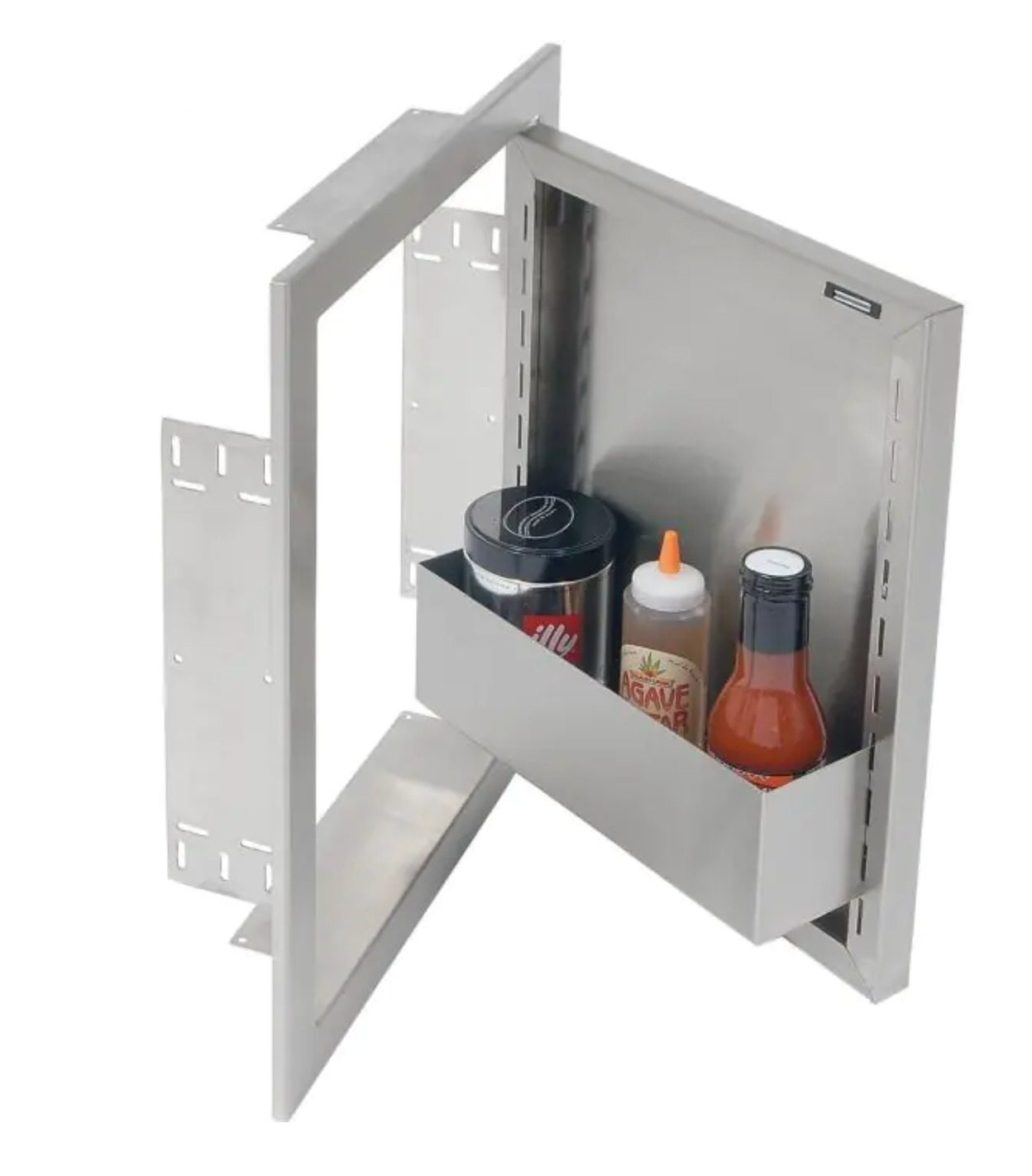 This Alfresco Left-Hinged Single Access Door provides easy and attractive access into your outdoor kitchen island. You can never have too much storage space! The 17-inch door is constructed from 304 grade stainless steel for durability and easy maintenance, offers multiple mounting options, as well as a storage rail inside the door for holding your grilling spices, seasonings and more. This AXE model door features a sleek handle for easy opening. Stamped with the Alfresco logo, you can be assured you are receiving high quality equipment.