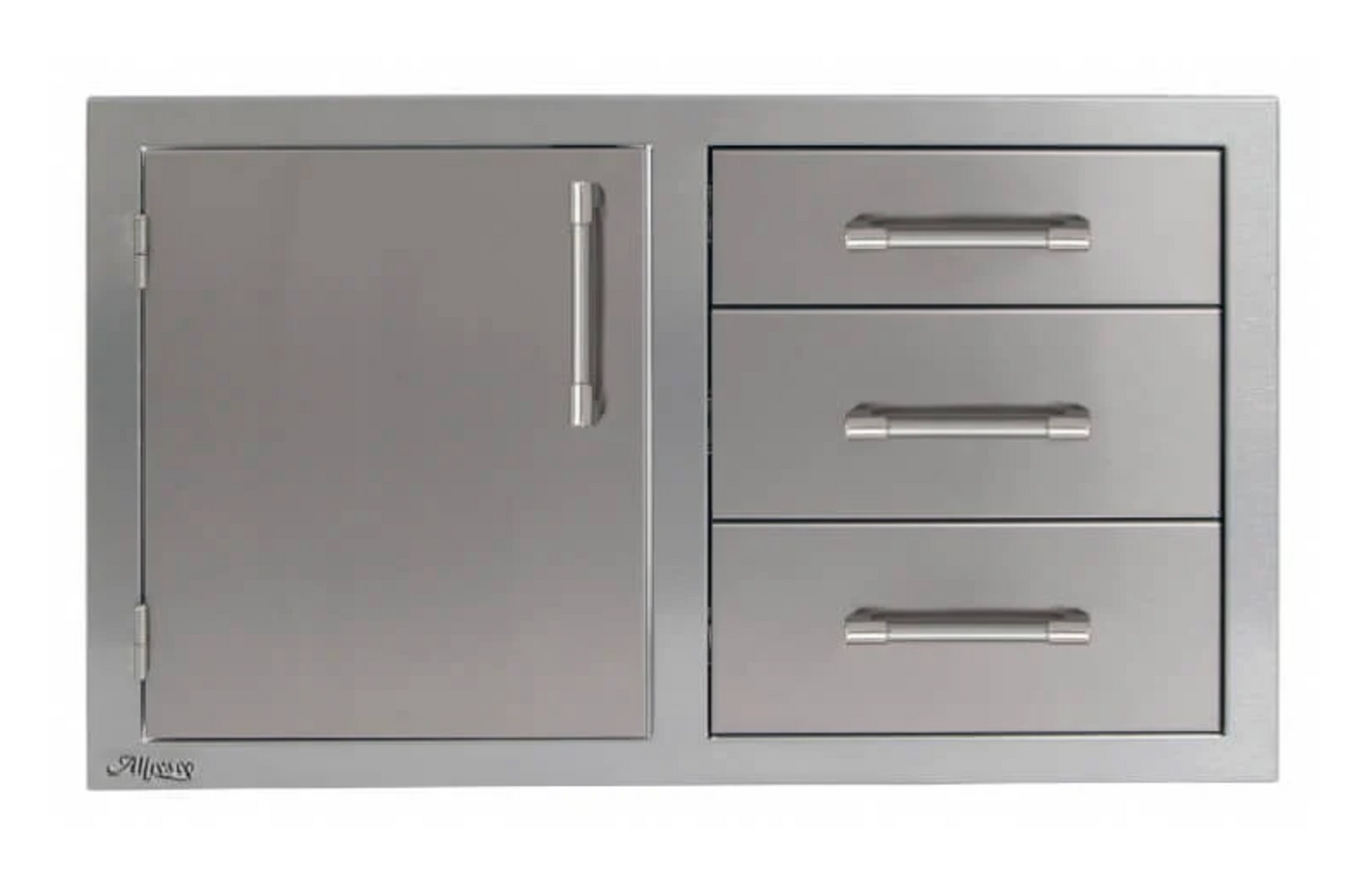 The Alfresco 32-inch Stainless Steel Left-Hinged Soft-Close Door & Triple Drawer Combo is the ultimate storage upgrade for your outdoor kitchen. With ample storage space and organizational features, this combo unit is designed to fit seamlessly into your outdoor cooking area.