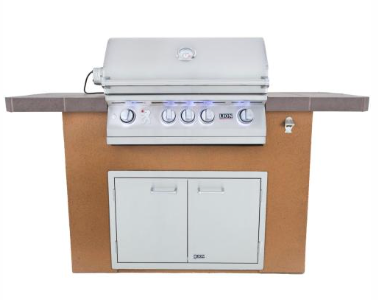 Enhance any backyard with your Lion Outdoor BBQ Island. The Lion Prominent Q BBQ Island is the perfect centerpiece for parties, entertaining, or just an afternoon with the family. The Prominent Q offers everything you need in one easy package, so you do not have to sweat the details. The island comes with the Lion 32 Inch stainless steel built-in gas grill, griddle, grill cover, bottle opener, and double access doors. The Lion 32-inch BBQ 304 stainless steel grill has Five Lion Quick Lite valves to ensure a fast, steady flame for grilling startup, and push-to-turn knob design for easy operation. The double layer, seamless welded, stainless steel grill head with polished edges deliver durability to your grill. Four cast stainless steel burners and an infrared rotisserie back burner push 15,000 BTUs each, adding 75,000 total BTUs of cooking power to this gas grill. Premium solid stainless steel cooking grates resist wear and tear, and provide 830 square inches of grilling space (647 main cooking area and 183 secondary cooking area). The 33 x 22 stainless steel double access door features a convenient paper towel holder to help you keep the mess to a minimum and adds storage to your island.