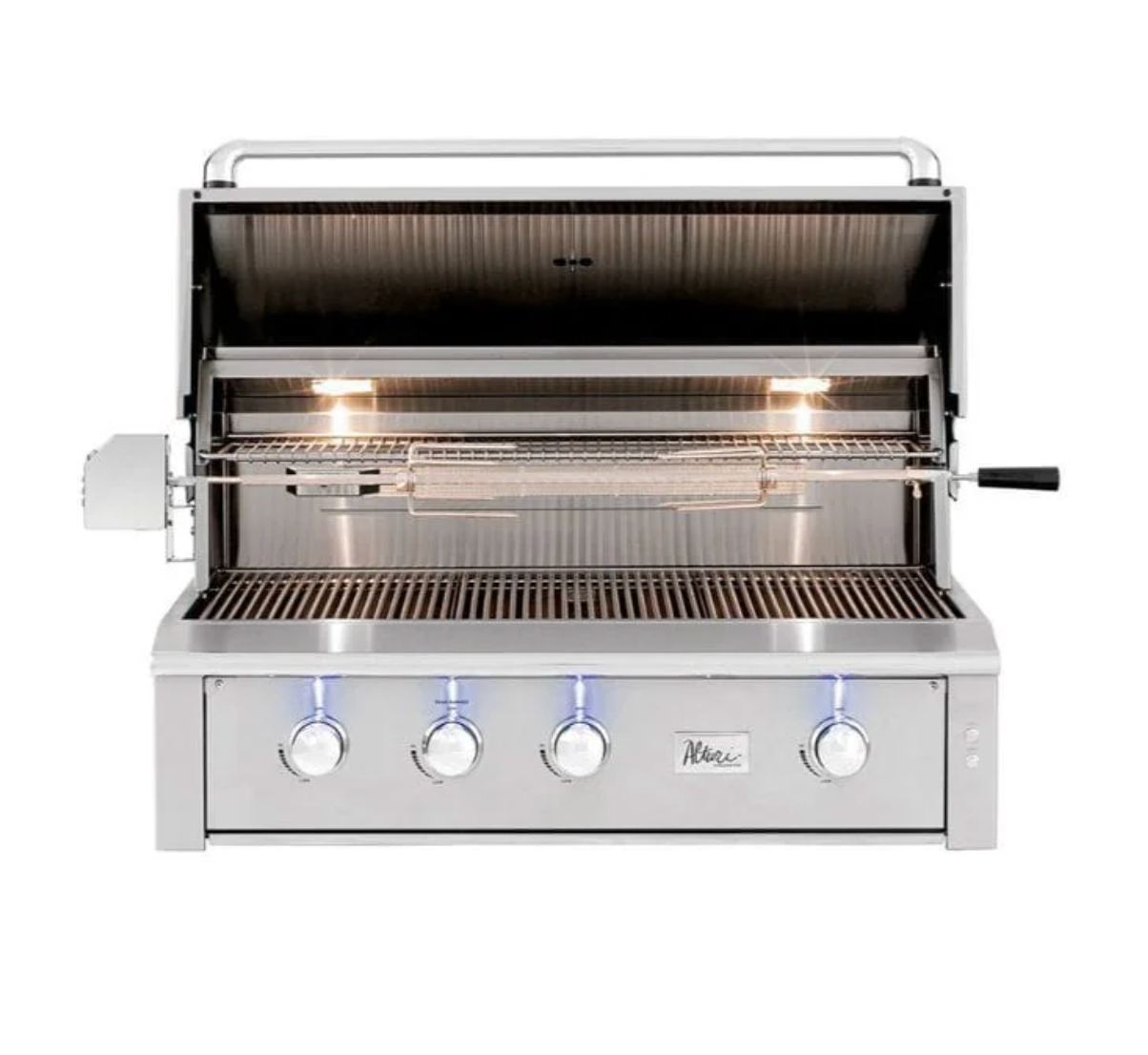 Alturi Series 42" Built-in Grill - Made entirely in the USA, the Alturi Series can be summed up in one word: luxury. Designed with elegance, fueled with raw power, and loaded with every feature, this grill sets the bar for luxury outdoor cooking. Details like the angle-mounted interior lights, rotisserie storage, and spring-assisted hood provide ultimate convenience, while it's solid #304 stainless steel construction and high BTU Red Brass/Stainless Steel burners – the most durable in the market – guarantee lasting performance. When it comes to performance, quality, and style, Alturi truly stands alone.
